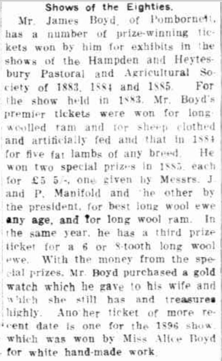 James was a member of the Camperdown and Colac P&A societies. He was also an exhibitor at the local shows with his Lincoln sheep and in 1932, he revealed to the Camperdown Chronicle his collection of prize cards from the 1880s. He was also proved himself a thoughtful husband, having bought Mary a gold watch with his winnings.