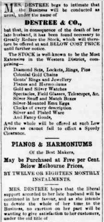 O’DONNELL, Annie – Died 20 November 1917 at Hamilton. Annie O’Donnell was born in Limerick, Ireland around 1840. She arrived in Victoria and on 1 February 1863, she married Adolphe Jean Baptiste Destree born at The Hague, Netherlands. Adolphe was a Hamilton jeweller and watchmaker who previously had a shop in Portland. He also served as a Magistrate. A son Adolphe was born at Hamilton in 1864, the first of a family of five sons and one daughter. In November 1868, Annie became Lady Mayoress of Hamilton when Aldophe was elected Mayor. On 11 February 1875, Annie gave birth to a son but exactly four months later on 11 June, Adolphe died aged forty. Annie continued the business but by September 1875 she had sold to Farroll & Sons Jewellery Importers.