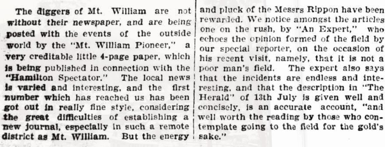 Eventually, George returned to Hamilton and went to work at the Hamilton Spectator as a journalist. His father died in 1899 and George’s brother Herbert took over the running of the Spectator. In 1900, gold was discovered at the foot of Mount William in the Grampians. It wasn’t long before the area was populated with those seeking their fortunes. George travelled to the Grampians to see the diggings for himself and decided to start a newspaper for the miners called The Mount William Pioneer. Printed at the Hamilton Spectator, the paper and it was very popular with twenty-three editions published between July and December 1900. The rush was short-lived and the newspaper folded.