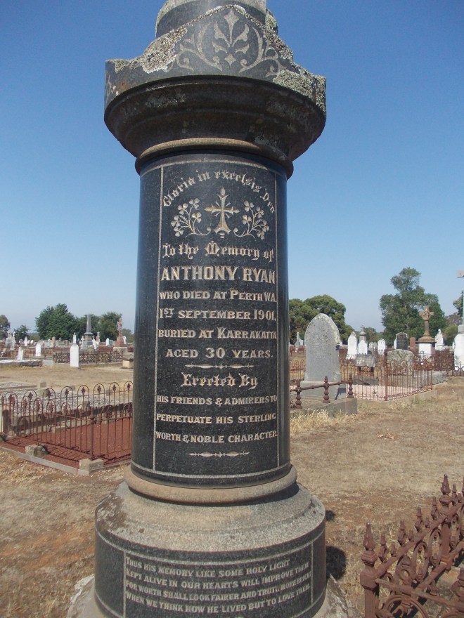 The Mt Lenora Miner, reflecting back only five months before when Tony was leaving Leonora, commented, “frequent were the remarks that the future premiership of the colony was within Mr Ryan’s grasp”. The Mount Morgans Miner remembered him as one of the pioneers of Malcolm. Tony was only thirty when he died but had done so much and had such a bright future. He was likened in several obituaries to West Australian Charles Vosper who died in January 190. They were taking similar paths into Western Australian public life. They were also buried in the same cemetery, both in the Roman Catholic section.